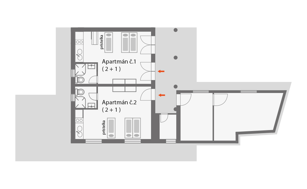 Na prízemí sú k dispozícii dva apartmány štúdiového typu 2+1.
